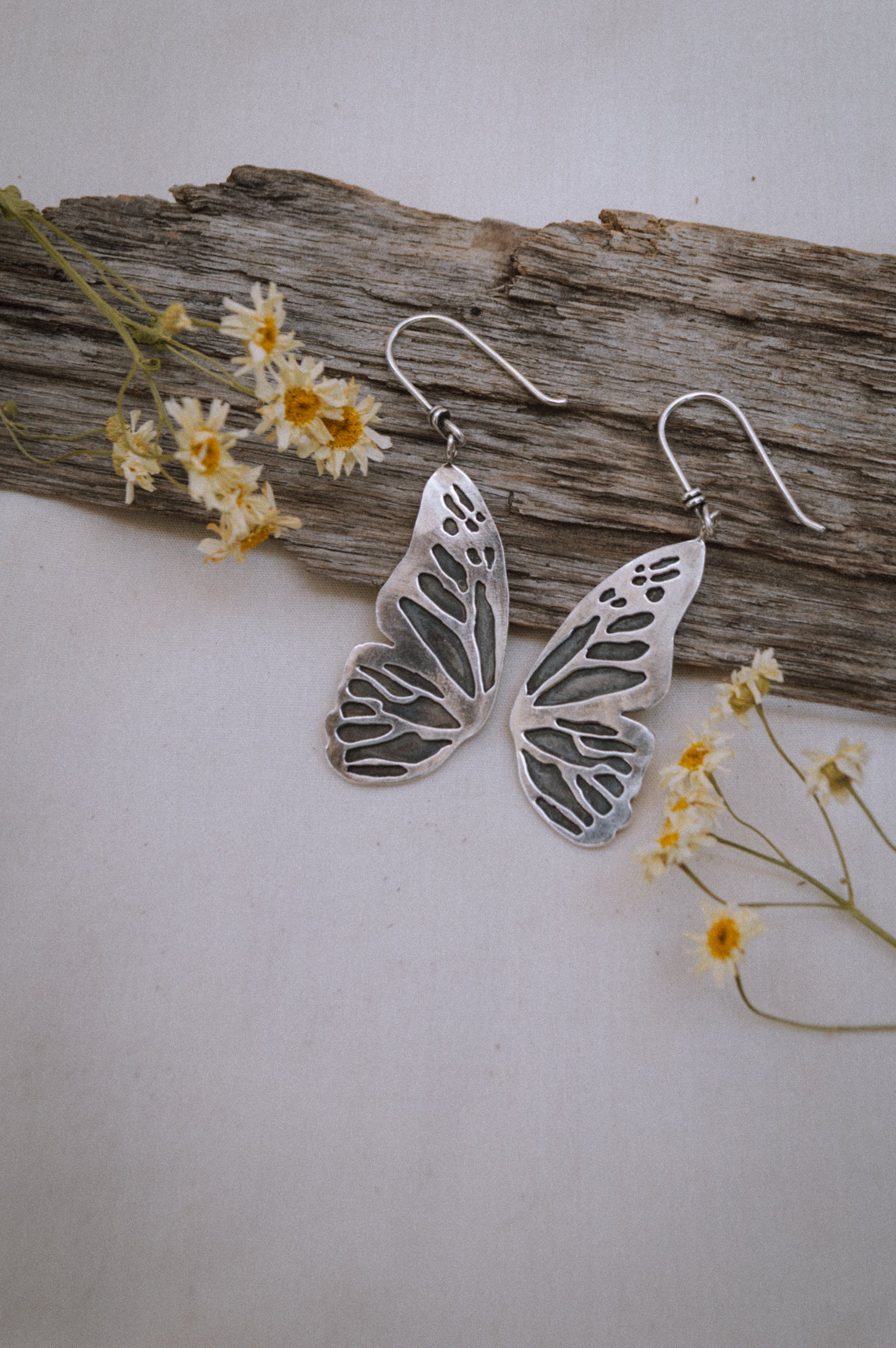 Simple and stunning. These butterfly dangle earrings are hand sawn from start to finish. Made from 100% sterling silver, handmade sterling ear wires as well.