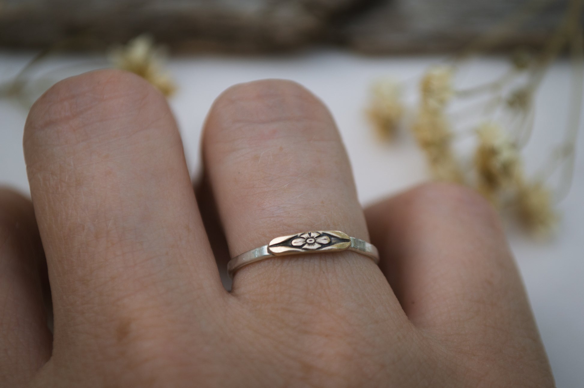 These hand hammered sterling silver stacking bands feature the sweetest little forget me not flower in 14karat gold. Perfect for those who mix metals! Don't forget to choose your size at checkout.